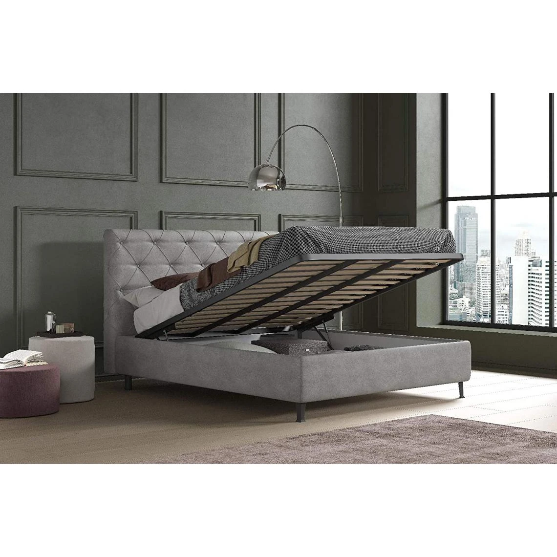 Points forts Alter Lit double avec conteneur, Revêtement en tissu, Lit avec tête de lit, Sommier à lattes 160×190 cm inclus, 224x180h128 cm, Couleur Gris