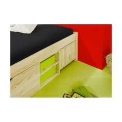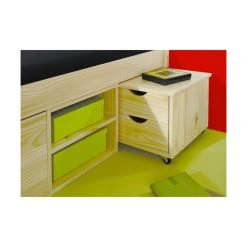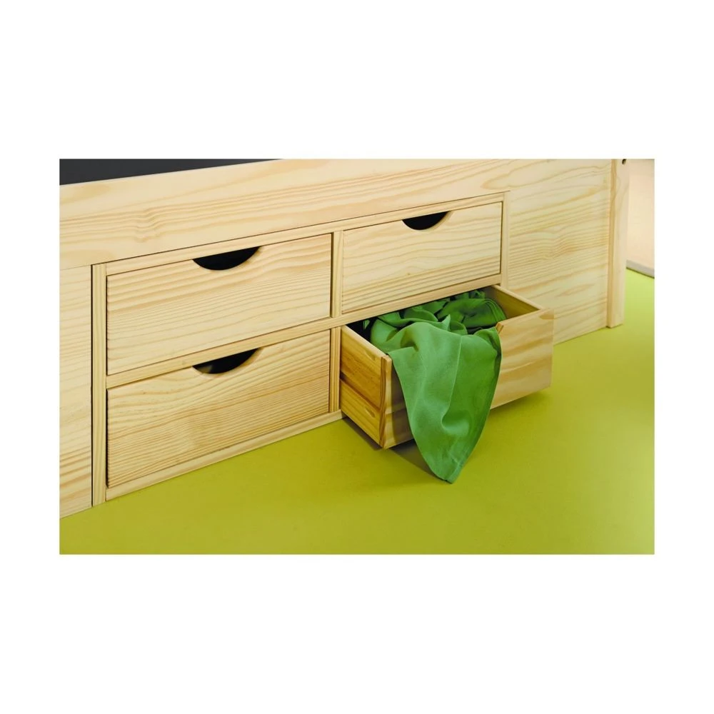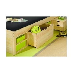 Lit verni naturel 180×200 cm offrant de grandes possibilitĂ©s de rangement : 4 petits tiroirs, 2 grands tiroirs sur roulettes, et 2 chevets sur roulettes Ă©galement, pouvant s’intĂ©grer Ă droite et Ă gauche du lit. Les tiroirs sont interchangeables et peuvent se placer indiffĂ©remment dans chaque emplacement. La hauteur du lit est prĂ©vue pour un couchage facile. Structure en pin massif vernis naturel. Vendu avec sommier.