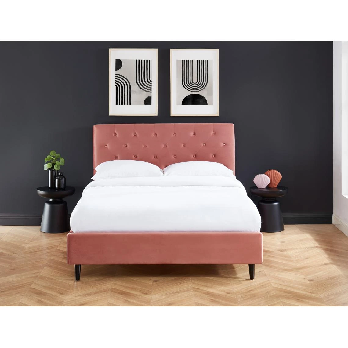 Lit double HUBERT – Structure en bois et contreplaquĂ© – RevĂȘtement en velours rose – Sommier Ă lattes 140x190cm inclus – Pieds en bois massif laquĂ© noir H12 cm – Dimensions : L151 x P205 x H110cm.