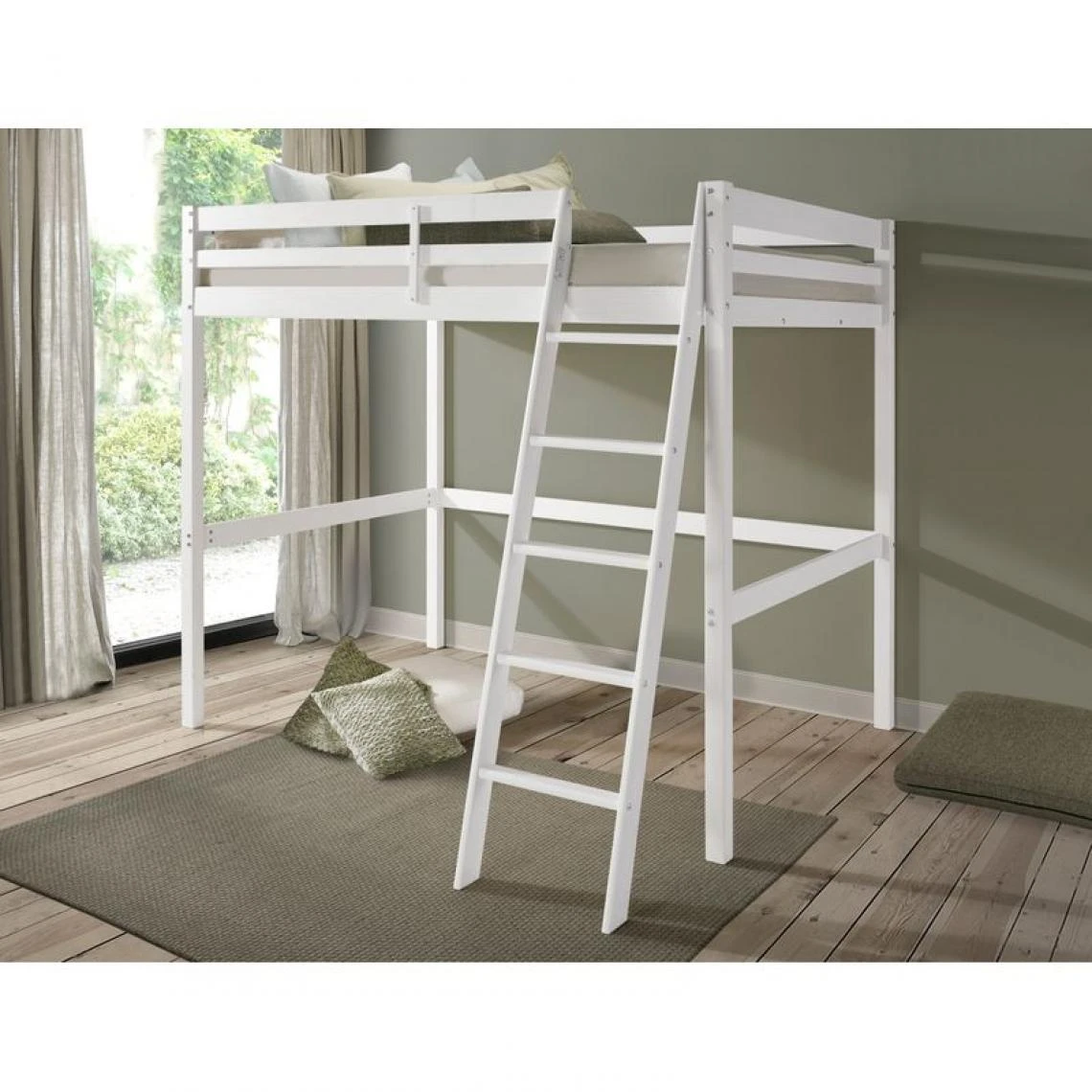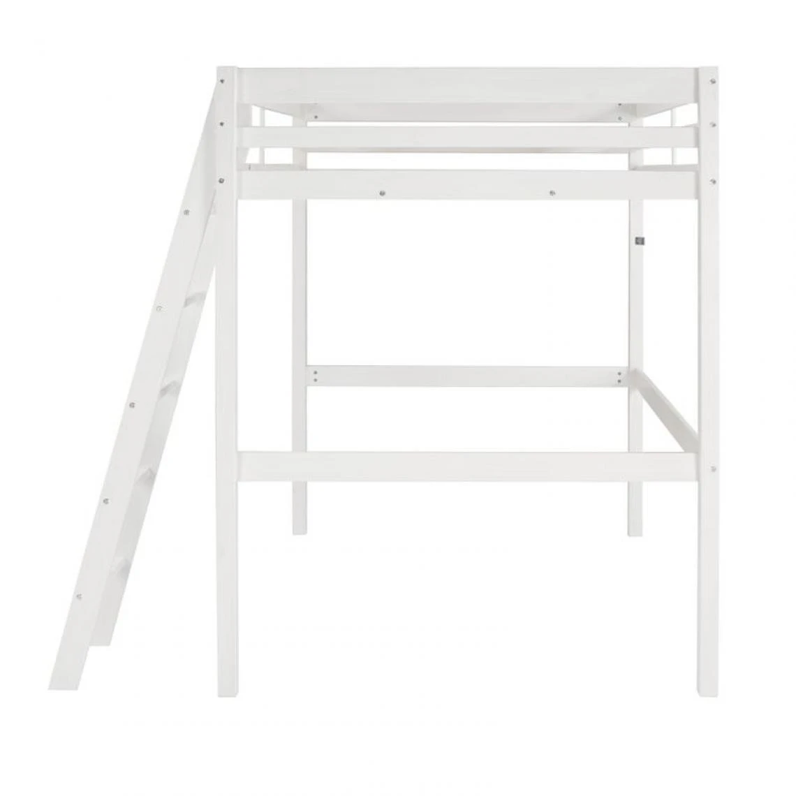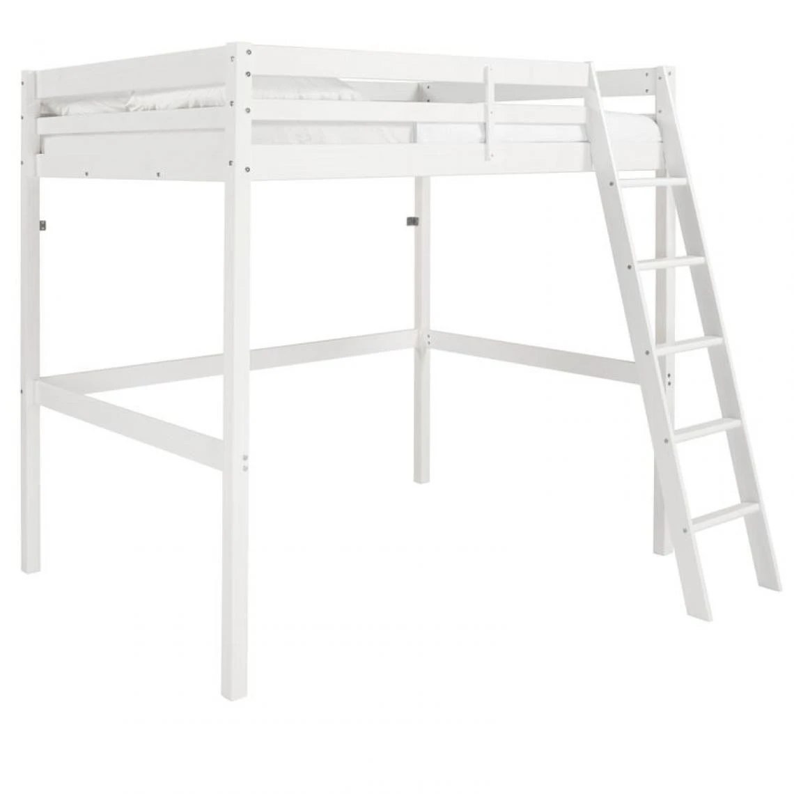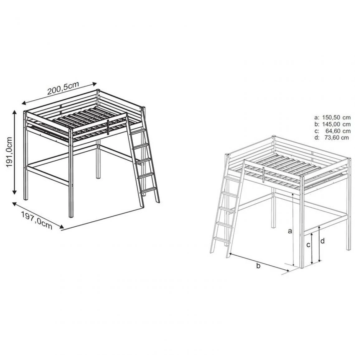 Structure :pin massif. . Finition :laquĂ© blanc. . Couchage en cm :140 x 190 (sans matelas). Hauteur maximum matelas : 19 cm. . Sommier :14 lattes en pin massif. Poids maxi supportĂ© : 120 kg. . Dimensions en cm :l. 197 – H. 191 – L. 200,5. . A monter soi-meme :. . Dispo pcs detachees donnee fournisseur :NC. . Garantie :2 ans. . Vendu sans matelas. . Le couchage en hauteur ne convient pas a des enfants de moins de six ans. . Conforme aux normes en vigueur. .