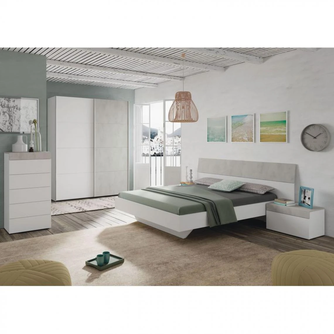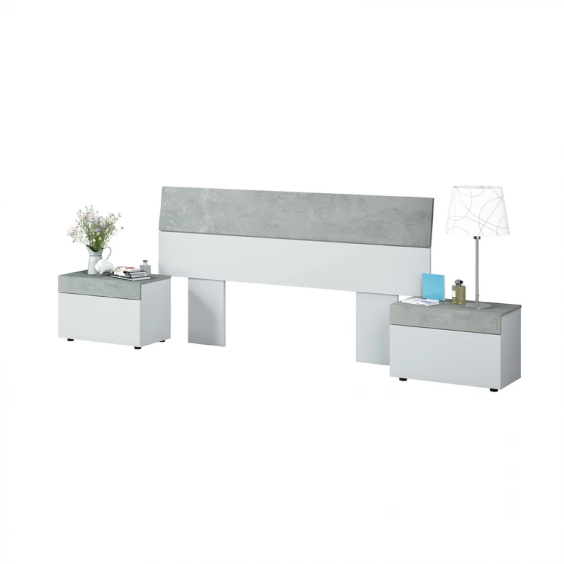 Conjuguant surfaces blanches et finitions effet béton, cet ensemble tête de lit + 2 chevets TEKKAN parachève l’ameublement d’inspiration urbaine de votre chambre. Ses lignes rigoureuses structurent le décor, tandis que son design lumineux et épuré diffuse une note de douceur dans la pièce.